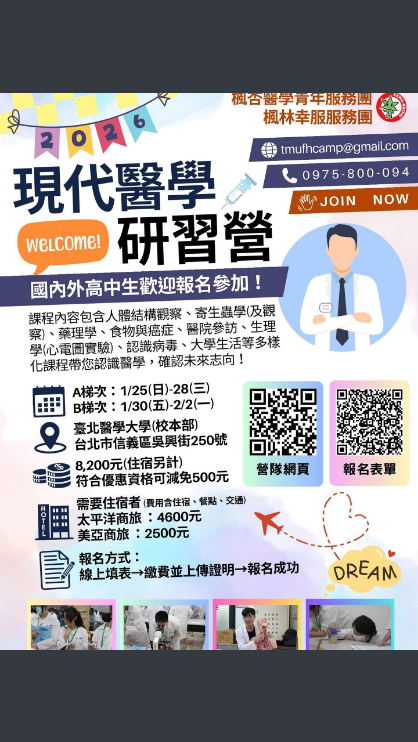 臺北醫學大學楓杏醫學青年服務團及楓林幸服服務團辦理「2026現代醫學研習營」活動,詳如附件。