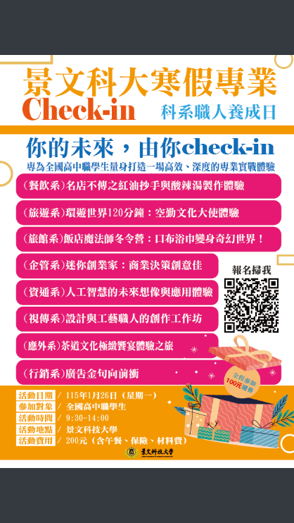 「景文寒假專業 Check-in:科系職人養成日」冬令營體驗活動,詳如附件。