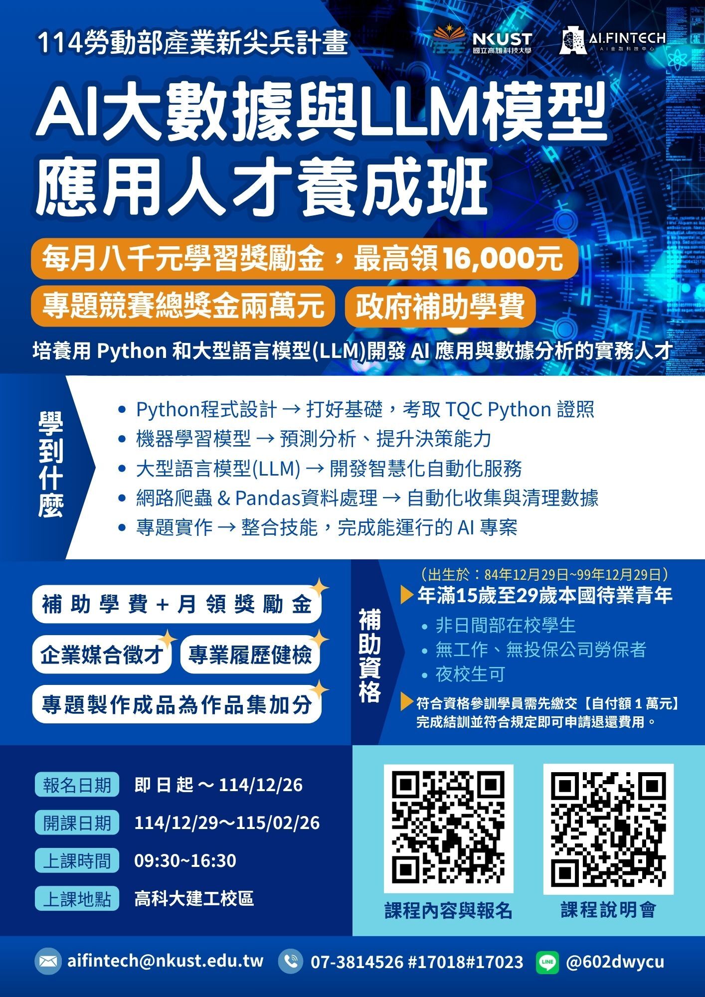 上課內容包含 Python、AI 應用、資料分析、機器學習、大型語言模型 (LLM)、網路爬蟲、程式交易等實務技能