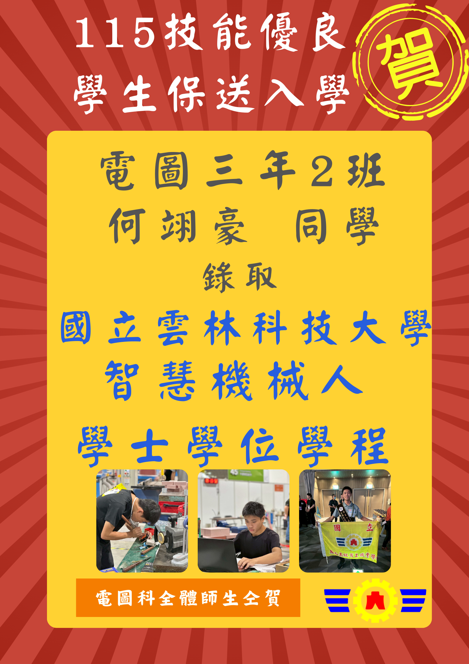 【狂賀】電圖三年2班何翊豪同學 技優保送入學 🎉🪅 錄取 🎉🪅 國立雲林科技大學