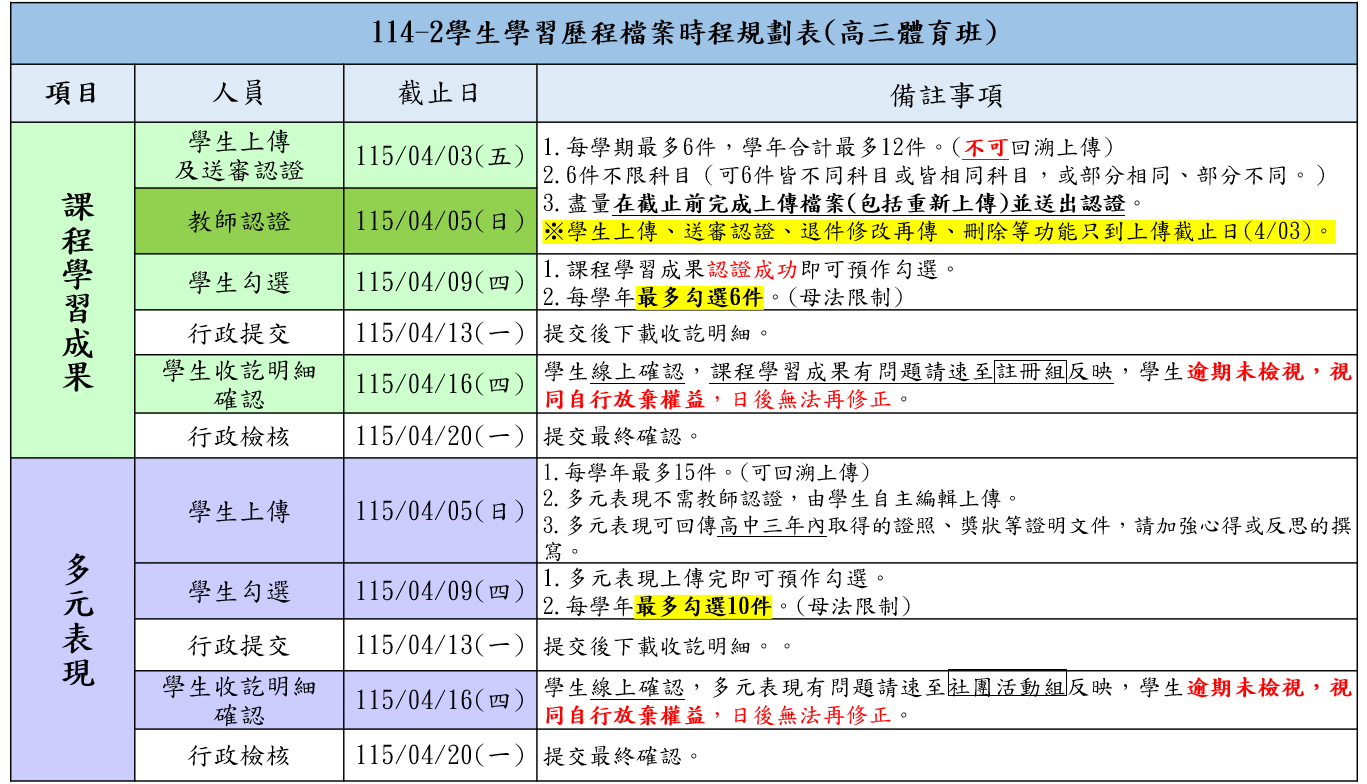 學生學習歷程檔案114學年度第2學期上傳重要時程(高三體育班)