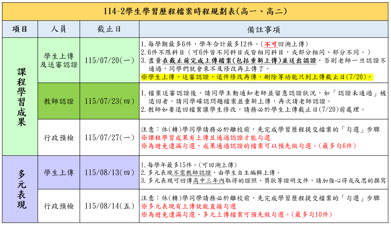 學生學習歷程檔案114學年度第2學期上傳重要時程(高一高二)