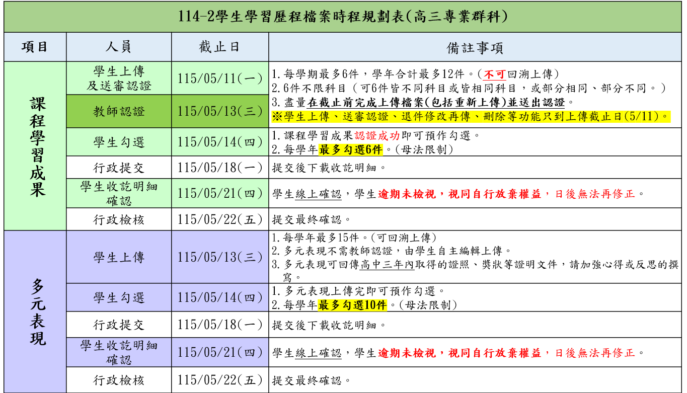 學生學習歷程檔案114學年度第2學期上傳重要時程(高三專業群科)